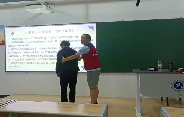 活动伊始,陈旭东老师通过图文讲解,仔细地为同学们讲述了防溺水知识要点及落水如何自救等防溺水安全知识,并与现场的同学进行互动,让学生亲身体会溺水时的感受。还结合实际案例给同学们详细讲解了防溺水“六不要”,并从“叫”“伸”“抛”三个方面详细介绍了如何对溺水人员进行安全有效的救助。在活动现场,陈老师邀请了一位同学上台,向大家展示正确救助溺水者的方式,加深了同学们对防溺水知识的认识和理解。