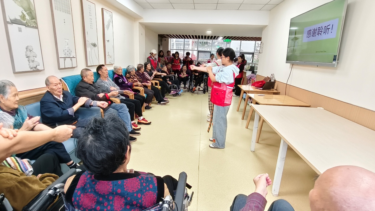 宣讲结束后,文艺表演与趣味游戏轮番登场,将氛围推向高潮。王可婷、代裕恒带来舞蹈《日不落》,轻快舞步让老人们纷纷拍手叫好;刘馨演唱的《Newboy》节奏明快,志愿者还走到老人身边轻声互动;杨静怡、黄婉夏的魔术表演更是勾起老人兴趣,不少人凑近观看,不时发出惊叹。互动环节中,罗慧仪、郭晴、徐逸瑄组织 “你划我猜”,用一些老人熟悉的词语带动参与;朱瑞涵、白耀华主持趣味答题游戏,题目围绕健康常识展开,答对的老人还能收获小礼品,现场欢声笑语不断。