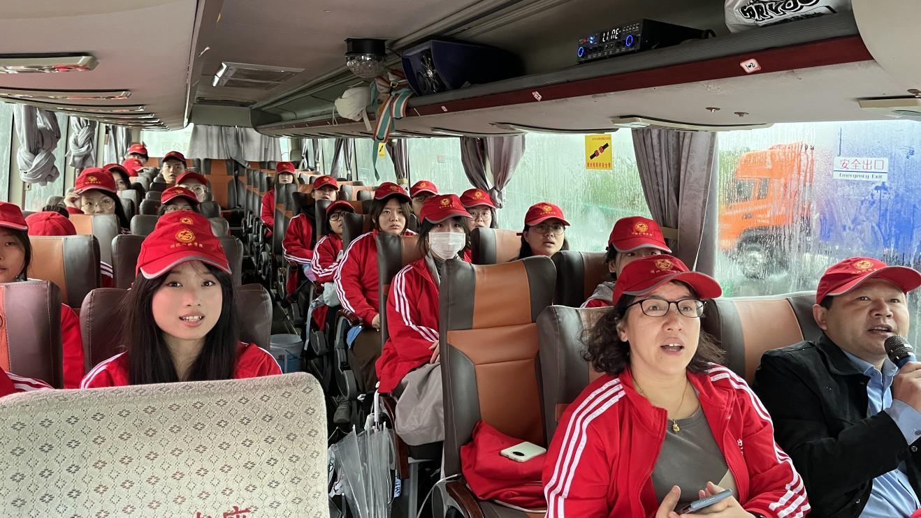 当日虽细雨霏霏,却丝毫未减师生们的参与热情。大巴车行驶途中,团委副书记杨兴颖率先组织趣味互动环节,为这段旅程预热。“数字炸弹” 游戏里,大家屏气凝神、精准猜测,在紧张的博弈中展现敏锐思维,猜中者的即兴演唱更是瞬间点燃车厢氛围;“逛三园” 游戏时,众人反应敏捷、各显神通,答错者略带羞涩的歌声,为旅途增添了不少轻松欢乐的气息。车厢内欢声笑语此起彼伏,与窗外微凉的阴雨天气形成鲜明反差。互动尾声,党委副书记周立勇起身领唱,带领全体师生共同唱响《歌唱祖国》等红色经典歌曲。激昂的旋律在车厢内久久回荡,将青春向党的奋进力量深深镌刻在每个人心中。