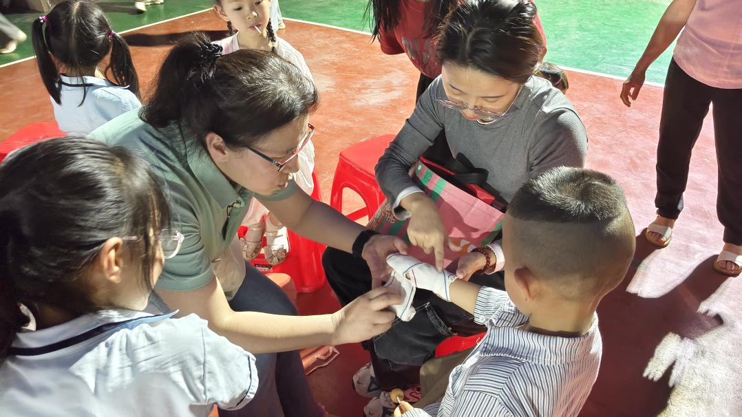 知识讲解结束后,公共卫生与健康学院的阎老师带领工作人员们进行现场包扎演示。利用医用纱布和绷带,工作人员向现场的小朋友和家长们展示了正确的包扎方法。"包扎时要绕过大拇指,整体呈‘8’字绕法。"阎老师一边解说,一边在小朋友的手上进行操作。孩子们对此十分感兴趣,学会之后还在同伴的手上进行试验。